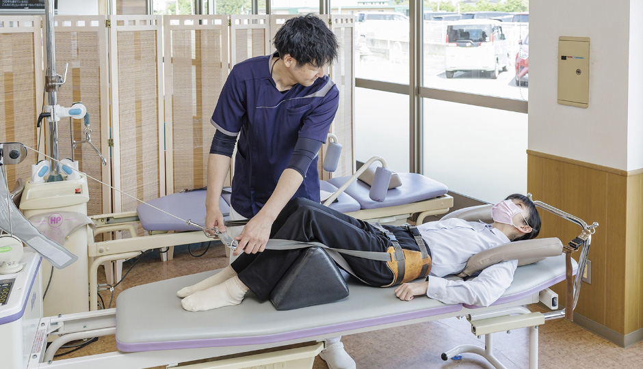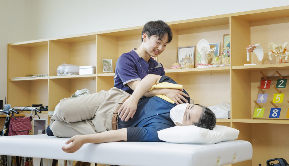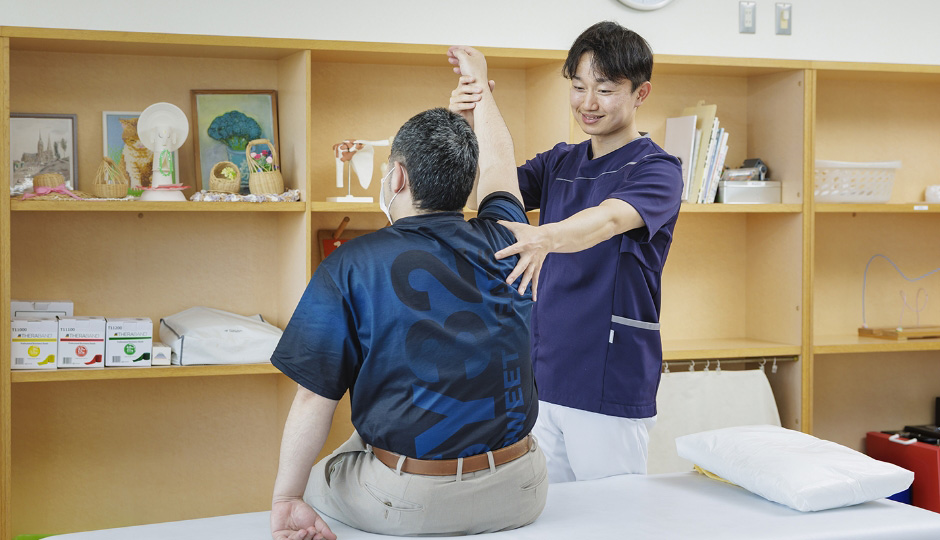患者さんの状態に合わせてストレッチ・マッサージ・関節可動域訓練・筋力訓練などを行います。徒手による施術や運動器具を活用したリハビリを実施し、自主練習の指導も行っています。