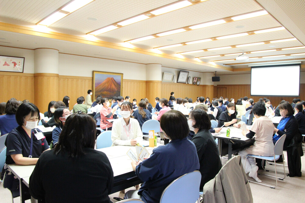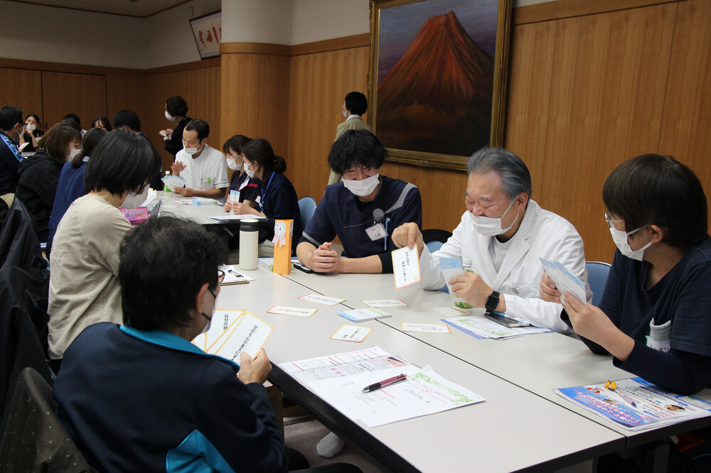 地域のケアマネジャー、訪問看護師、市役所職員など関係機関の皆様にご参加いただき、「語ろう、つなごう、地域で広げるACP」をテーマに講義とグループワークを設けました。当院からは医師、看護師、薬剤師、医療ソーシャルワーカーなどが参加し、総勢80名、15テーブルに分かれて活発な意見交換を行いました。