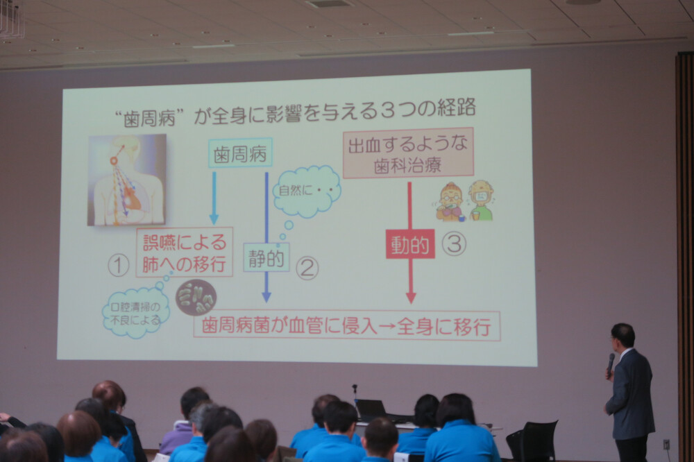 令和8年2月19日(木)、救急薬品市民交流プラザホールにて、射水市ヘルスボランティア120名を対象とした講演会が開催されました。射水市保健センターから依頼を受け、稲田雅一院長が「糖尿病と歯周病の意外な関係」について講演しました。