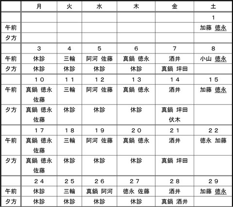 菅井 | 休診 | 休診 | 休診 | 平名 | 休診 |