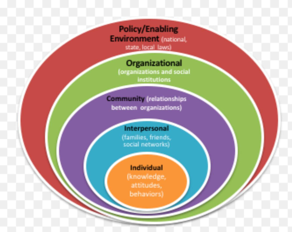 公衆衛生上の問題は、個人、複数人、コミュニティ、組織、政策といった複数のレベルが相互に作用して発生する(Ecological Model)と考えられます。講義では、各レベルでの詳細な分析モデルを用い、分析結果に基づいて介入ポイントを設定し、解決を目指す手法を学びました。