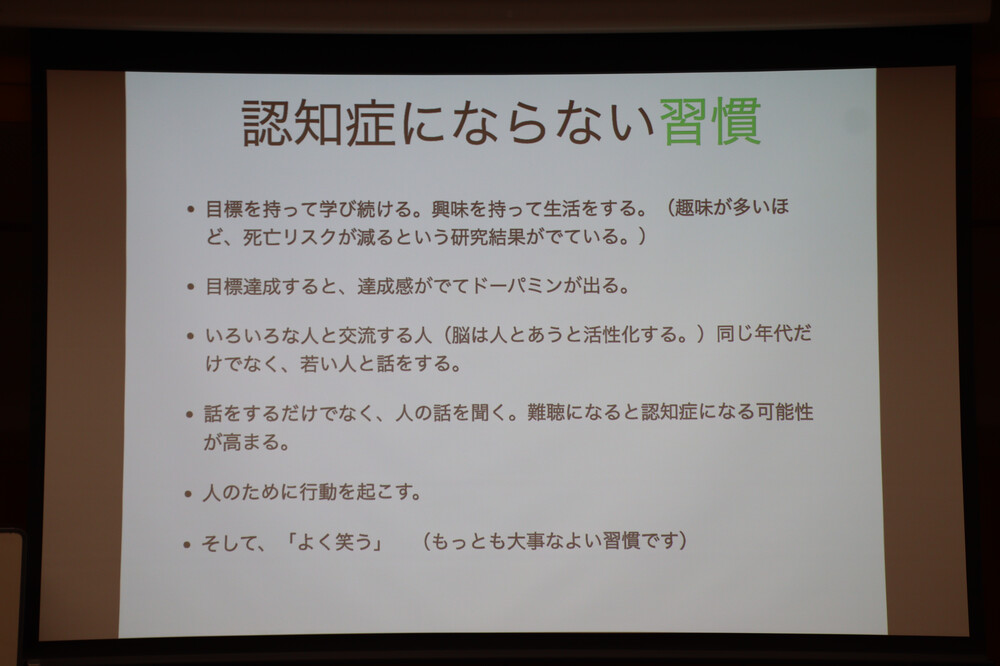 認知症の予防においても、単なる身体の問題ではなく、「人との関わり」や「好奇心」が大きな役割を果たします。年齢を重ねても、判断力や経験に基づく知恵はむしろ深まっていきます。さらに忘れてはならないのが、「孤独を避けること」です。孤独は健康に大きな影響を与え、時には喫煙以上のリスクになるとも言われています。だからこそ、このような場に参加し、人とつながること自体が、すでに健康づくりなのです。そして最後に、人生の本質についてです。人は生まれるとき、何も持たずに生まれ、そして去るときも、何も持っていくことはできません。