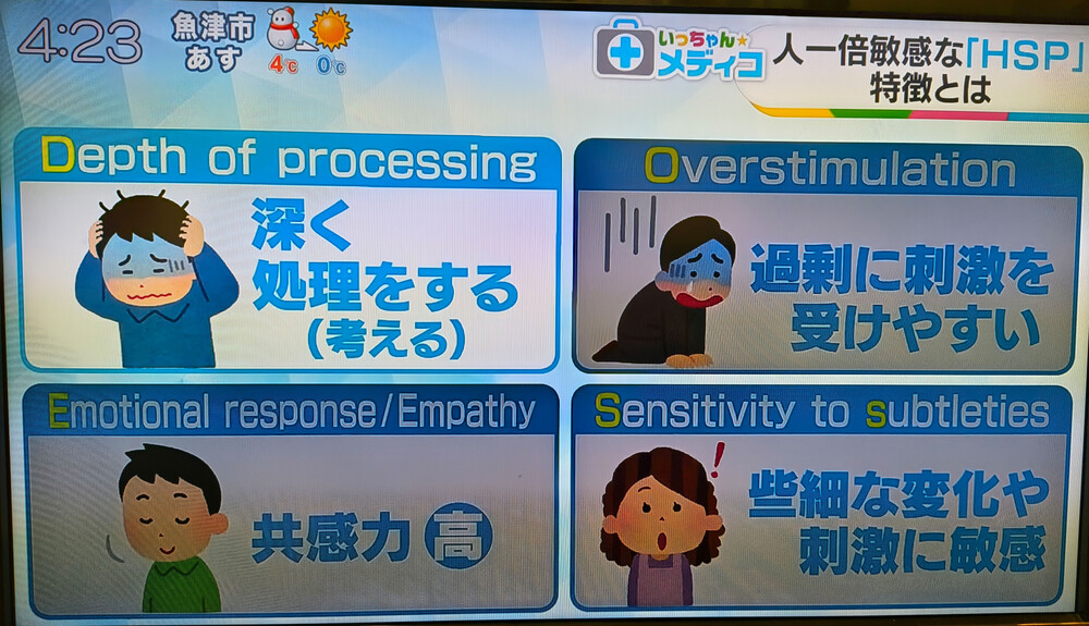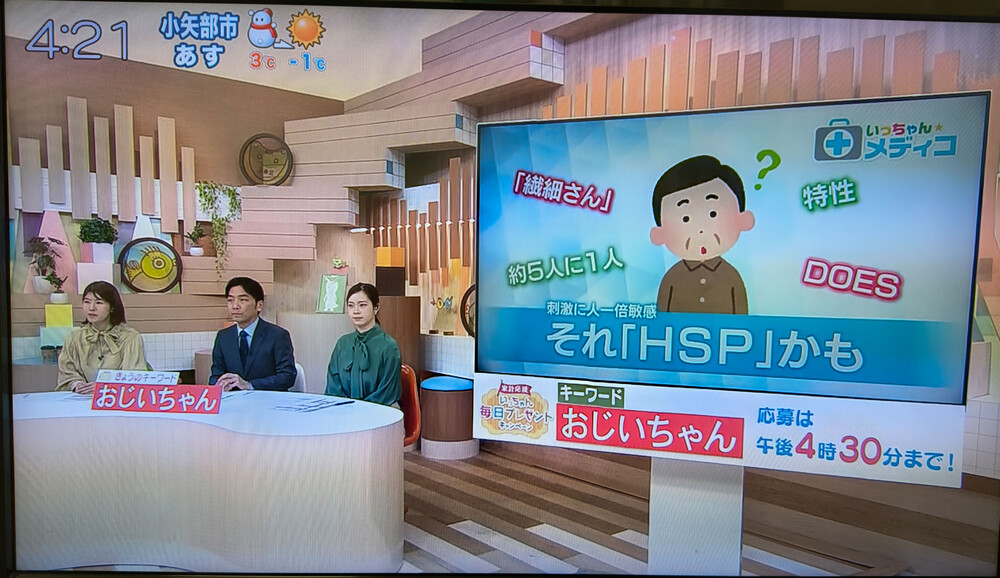 内容は「いっちゃんメディコ」医療系ニュース番組で、HSP(ひといちばい敏感な人)が取り上げられ、HSPに詳しい医師としてコメントをしました。