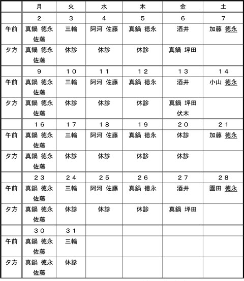 | 昼 | 休診 | 休診 | 真野 | 休診 | 休診 | 休診 |
