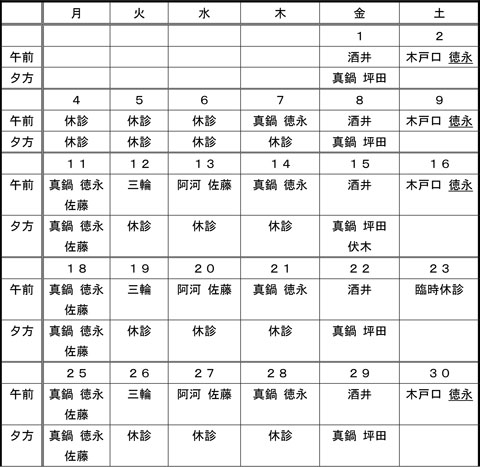 - | 休診 | 休診 | 休診 | 平名 | 休診 |